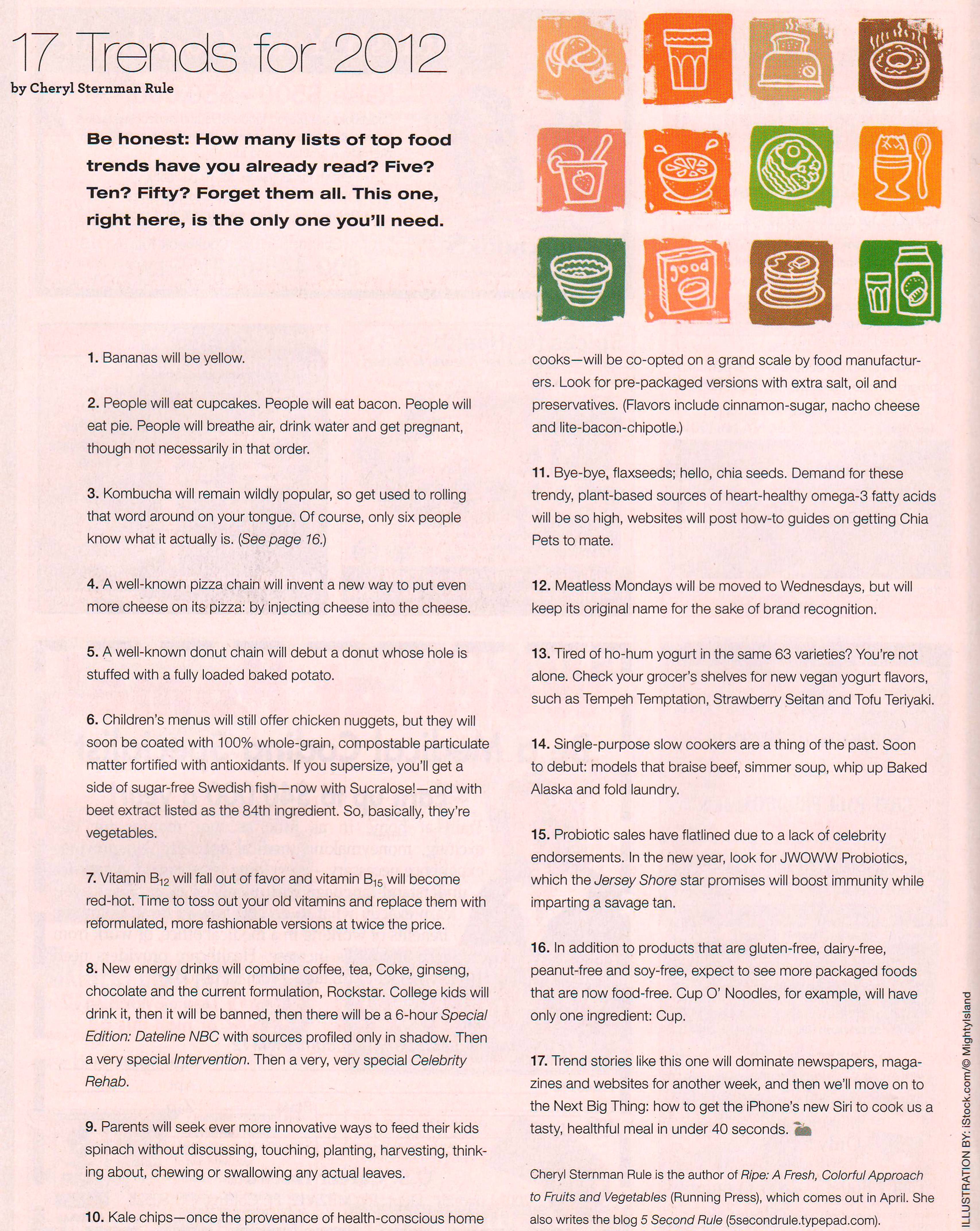 Wasting some time the other day, my daughter was browsing through an old copy of Eating Well magazine. The back page had a “Trends 2012” list – which I had skipped reading at the time for lack of interest in such lists. Until my daughter read it to me …. I don’t know who they assigned that back page to, but it is hilarious and well worth the (long-ish) read!! Enjoy the absurdity!